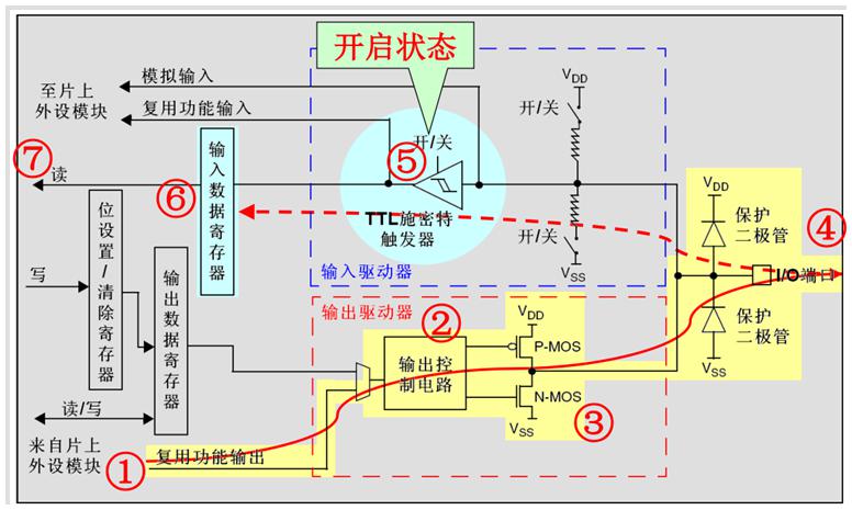 下拉輸入模式下,I/O端口的電平信號直接進(jìn)入輸入數(shù)據(jù)寄存器。但是在I/O端口懸空(在無信號輸入)的情況下,輸入端的電平保持在低電平;并且在I/O端口輸入為高電平的時(shí)候,輸入端的電平也是高電平。