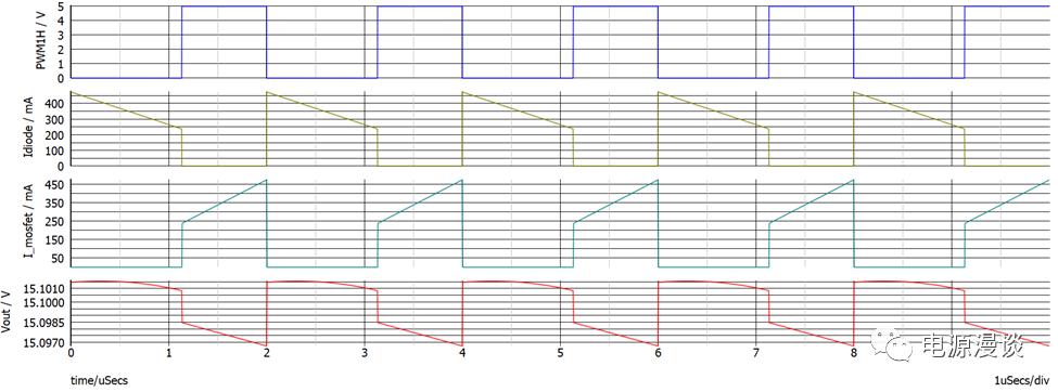 從圖13所示的相關(guān)變量測量值來看,占空比實(shí)際為43%,由于是非同步整流,比理想占空比偏大,而在155mV的電壓環(huán)給定下,輸出電壓為我們期望的15V設(shè)定值。
