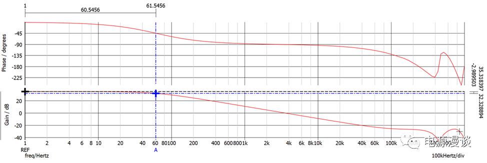 從仿真圖上的測量結(jié)果來看,穿越頻率為3.6kHz,主極點(diǎn)轉(zhuǎn)折頻率為63Hz,穿越頻率處相位為-90C,測量結(jié)果和第一部分的計(jì)算結(jié)果非常一致。