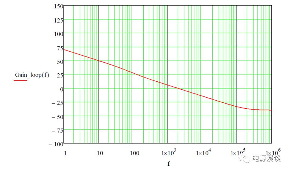 從控制器和功率級傳遞函數(shù)疊加的開環(huán)傳函來看,增益曲線在低頻段是一個積分環(huán)節(jié)的曲線,我們可以從曲線上讀取一些關(guān)鍵參數(shù)。