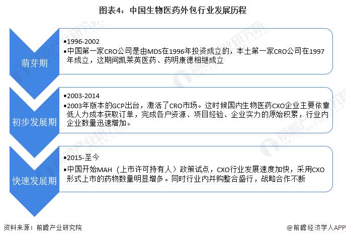 中國(guó)生物醫(yī)藥外包行業(yè)起步較晚,1996年,美國(guó)MDS Pharma Services公司在中國(guó)投資了第一家CRO企業(yè),主要為企業(yè)提供新藥的臨床研發(fā)服務(wù),拉開(kāi)了中國(guó)醫(yī)藥外包的序幕。2003年以來(lái),《藥物臨床試驗(yàn)質(zhì)量管理規(guī)范》(GCP)的頒布,激活了CRO市場(chǎng)的發(fā)展,GCP規(guī)定,申辦者可以委托合同研究組織執(zhí)行臨床試驗(yàn)中的某些工作和任務(wù),這期間行業(yè)企業(yè)數(shù)量速速增加。2015年,中國(guó)開(kāi)始MAH試點(diǎn),CXO行業(yè)發(fā)展速度加快,同時(shí)行業(yè)內(nèi)并購(gòu)整合盛行,戰(zhàn)略合作不斷。