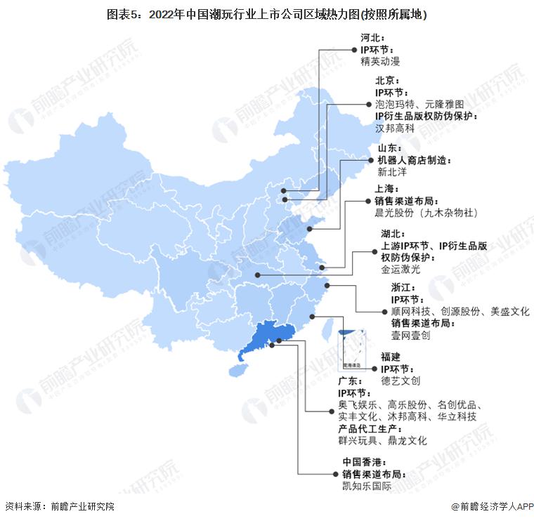 目前中國潮流玩具注冊企業(yè)主要分布在華北和華東,其中廣東是潮流玩具企業(yè)主要注冊的熱土。截止2022年7月,潮玩行業(yè)內的上市企業(yè)主要集中于東南沿海全區(qū)域,其中廣東省上市企業(yè)最多。