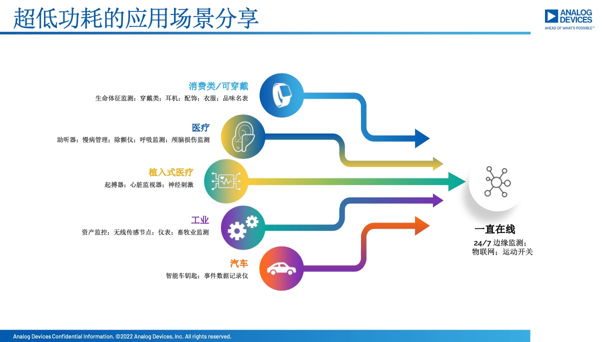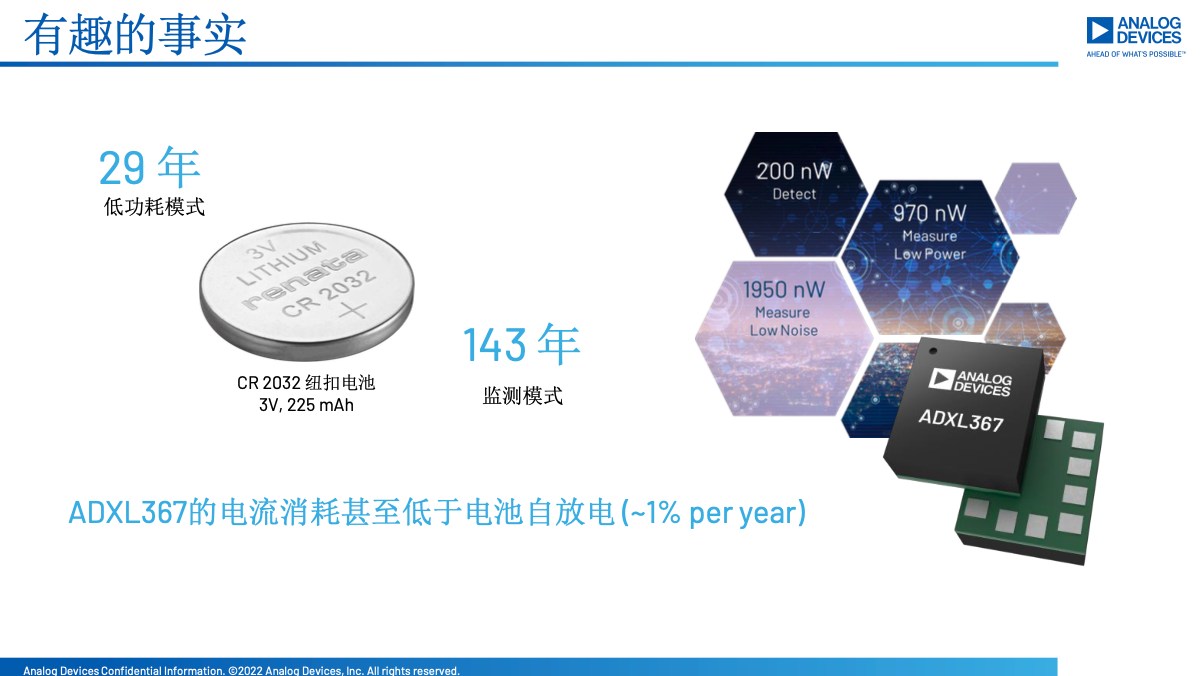 從ADI最新的MEMS加速度計的表現(xiàn)來看,在傳感器監(jiān)測模式下,其電流消耗已經(jīng)低于一個普通紐扣電池的自放電,可以實現(xiàn)143年的連續(xù)監(jiān)測,相比人的平均壽命而言,實現(xiàn)了“永久在線”。