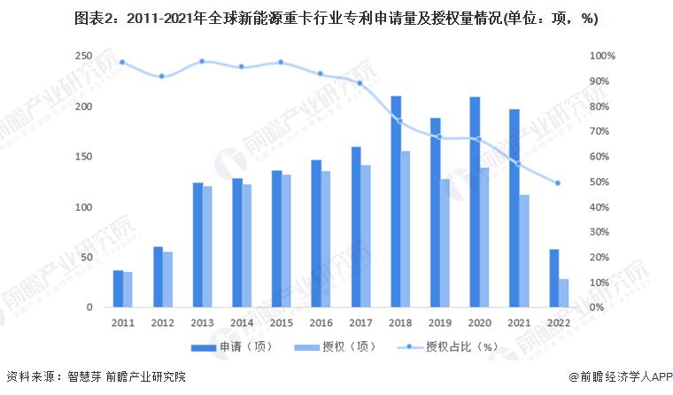 在專利授權(quán)方面,2011-2018年全球新能源重卡行業(yè)專利授權(quán)數(shù)量逐年增長(zhǎng),2019年開(kāi)始出現(xiàn)下降趨勢(shì),2021年全球新能源重卡行業(yè)專利授權(quán)數(shù)量為112項(xiàng),授權(quán)比重僅為56.85%。