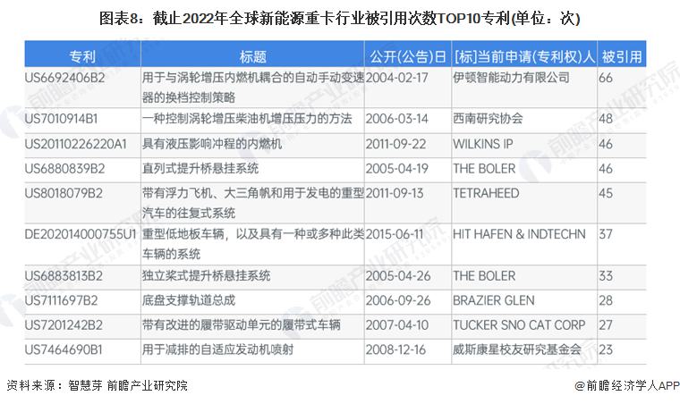 伊頓智能動(dòng)力有限公司申請(qǐng)的“用于與渦輪增壓內(nèi)燃機(jī)耦合的自動(dòng)手動(dòng)變速器的換檔控制策略”(專利號(hào):US6692406B2)是被引用次數(shù)最多的新能源重卡專利,被引用次數(shù)超過(guò)60次。其它被引用次數(shù)前十大專利如下所示: