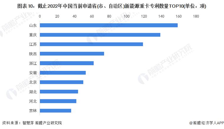 中國(guó)方面,山東為中國(guó)當(dāng)前申請(qǐng)新能源重卡專利數(shù)量最多的省份,申請(qǐng)量累計(jì)超150項(xiàng),其次是重慶地區(qū),其專利申請(qǐng)量近140項(xiàng)。除此,專利申請(qǐng)量排名TOP10省份還有江蘇、陜西、浙江、安徽、北京、湖北、河北和吉林。