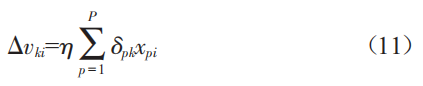 使用最陡梯度下降法,如等式(10)中那樣獲得中間閾值和輸出層閾值之間的權(quán)重校正量,并且輸入閾值和中間閾值之間的權(quán)重校正量由等式(11)表示。