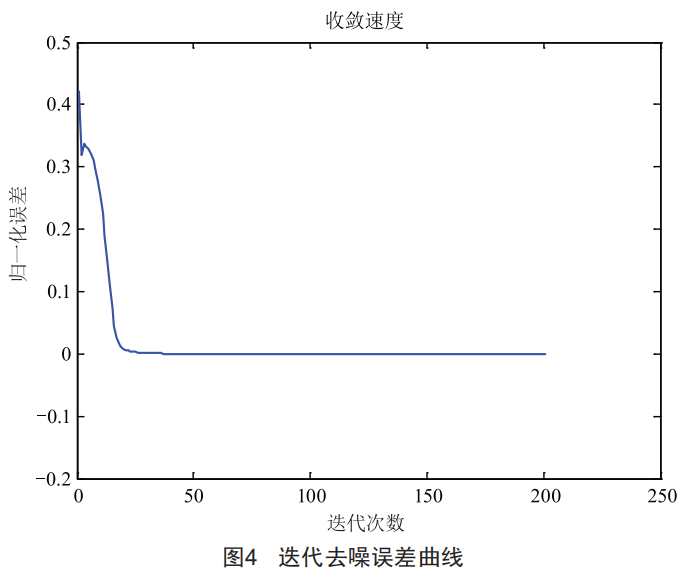 圖4是修改初始閾值后的迭代誤差曲線,從圖3、圖4對(duì)比可以得出,圖4的收斂速度增加了,但是收斂后的誤差性能接近。由此可以得出結(jié)論:合理范圍內(nèi)不同的初始閾值會(huì)影響到收斂速度,但不會(huì)影響到去噪性能,證明該算法具有一定的穩(wěn)健性。