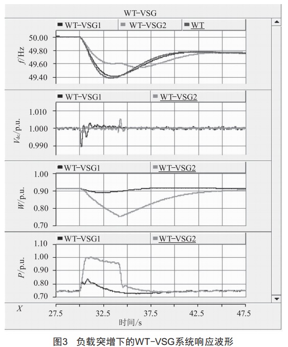 同時,可以明顯看出,WT-VSG2在功率超發(fā)模塊的控制下使用變流器的剩余容量對系統(tǒng)進(jìn)行了功率支撐。