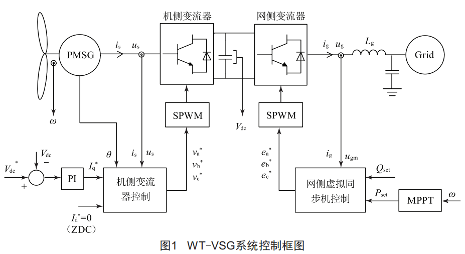 虛擬同步發(fā)電機(jī))VSG)技術(shù)是一種新興的逆變器控制技術(shù),它的主要思想是控制并網(wǎng)逆變器模擬傳統(tǒng)同步發(fā)電機(jī)的機(jī)電動態(tài)特性,將其應(yīng)用在風(fēng)電系統(tǒng)中則可賦予風(fēng)力發(fā)電機(jī)與同步機(jī)類似的內(nèi)部機(jī)制和外部特性。以往針對風(fēng)機(jī)虛擬同步發(fā)電機(jī)(WT-VSG)的研究大多將直流側(cè)能源用理想電壓源來替代,而這種方法既不精確也不符合工程實際。本文針對WT-VSG的詳細(xì)模型提出了一種新型的慣性控制方案,能提高風(fēng)電機(jī)組的慣性響應(yīng)能力。