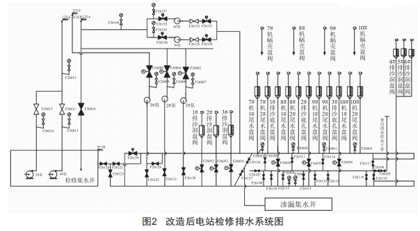 經(jīng)過(guò)改造,將原來(lái)的全廠一個(gè)檢修排水系統(tǒng)分為現(xiàn)在的機(jī)組檢修排水系統(tǒng)和泄洪排沙檢修排水系統(tǒng)兩個(gè)獨(dú)立運(yùn)行的系統(tǒng),又通過(guò)兩個(gè)排水系統(tǒng)各自的干管放空管與滲漏集水井相連,使?jié)B漏排水系統(tǒng)又成為這兩套檢修排水系統(tǒng)的備用排水系統(tǒng)(圖2),廠內(nèi)檢修排水方式更加靈活、多樣,徹底消除了存在多年的水淹廠房的安全隱患。