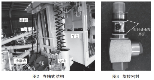 航班量大的機場平臺升降頻率更高 ,液壓管路從平臺下方接到平臺上方是通過兩個彈簧卷盤來連接的 。這幾根液壓管路基本是平臺和懸臂緊急降落使用 ,如果增加其他一些液元件 ,相應的液壓管路也要增加。其原理圖如圖1所示(僅為平臺和懸臂緊急降落) , 圖中 , 需要從車架連接到平臺上的管路為平臺緊急降落管路和懸臂緊急降落管路 ,共4根液壓管 , 結構如圖2所示 。長時間使用后 ,經(jīng)常出現(xiàn)卷盤旋轉密封處滲漏 , 經(jīng)分析 , 由于卷盤旋轉面密封采用軸上套0形圈的形式(圖3) ,在反復旋轉后0形圈出現(xiàn)磨損 ,密封不嚴 ,導致液壓油滲漏 。期間也通過改進0形圈的結構形式來進行處理 ,但仍無法徹底解決滲漏問題 ,特別是在嚴寒地區(qū) , 由于日夜溫差大 ,旋轉密封件有一定的冷熱變形 ,使用的期限更短 。實際使用中如出現(xiàn)旋轉接頭處液壓油突然泄漏 ,將導致液壓管路直接泄壓 ,平臺無法上升 ,并且會有高壓液壓油噴出 ,對人員造成傷害 。另外 , 由于使用轉盤形式 ,所需液壓膠管最小折彎半徑比較小 ,無法使用普通成熟的液壓膠管 ,實際使用中采用尼龍管會導致低溫地區(qū)展開后無法繼續(xù)纏繞 。如果想在平臺上繼續(xù)增加液壓元件 ,彈簧卷盤的液壓管路容量又不夠 ,需要重新定制新的卷盤 , 限制了后期功能的擴展。