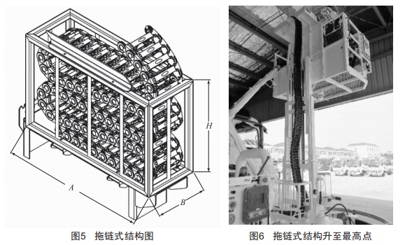 當平臺上升時 ,拖鏈隨著平臺的升高而升高 , 最高點如圖6所示 。拖鏈兩端分別用螺栓固定在平臺和框架上 ,這樣可以避免液壓膠管直接受到拉力。
