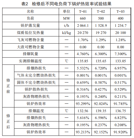 從試驗(yàn)結(jié)果看,機(jī)組負(fù)荷在660Mw、500Mw、400Mw時(shí),修正前鍋爐熱效率分別為93.299%、92.024%、9l.785%,修正后鍋爐熱效率分別為93.2l3%、92.l52%、9l.920%(表2)。三個(gè)工況下的鍋爐效率均未達(dá)到設(shè)計(jì)值,特別是500Mw和400Mw時(shí),效率較設(shè)計(jì)值偏低較多,雖然固體不完全燃燒熱損失較設(shè)計(jì)值低0.34%~0.48%,但排煙熱損失卻較設(shè)計(jì)值高0.65%~l.86%,導(dǎo)致鍋爐效率偏低。