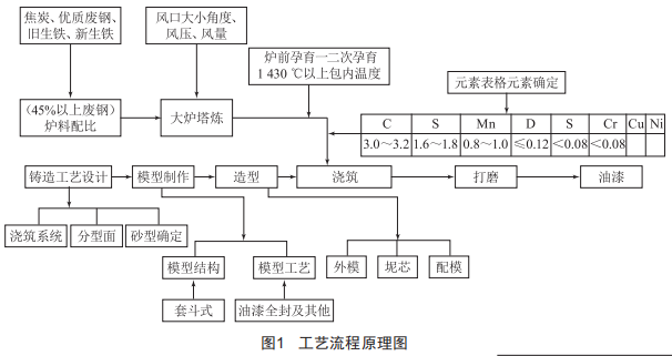 )沖天爐參數(shù)的選擇: 以高碳當量的理念做高強度、低應(yīng)力的鑄件 ,我們是以沖天爐作為工具來熔煉鐵水的。沖天爐為兩臺7 t熔化率的熱風沖天爐 ,是在原有的5 t冷風沖天爐上進行改進的。沖天爐風口為大排距大風口形式 ,二排風口排距為900 ,每排8只風口:上排風口直徑小45 ,傾斜度59: 下排風口直徑小48 ,傾斜度39 。鼓風機為75 kw的羅茨鼓風機 ,焦炭選用鎮(zhèn)江焦化廠生產(chǎn)的固定碳大于90%的優(yōu)質(zhì)焦炭 ,焦炭塊度大小160~200 mm。