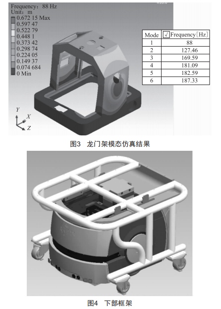 圖3為龍門架模態(tài)仿真圖 ,其中一 階模態(tài)為88 Hz ,遠(yuǎn)好于 APR500/l0產(chǎn)品模態(tài) ,符合設(shè)計(jì)需求。