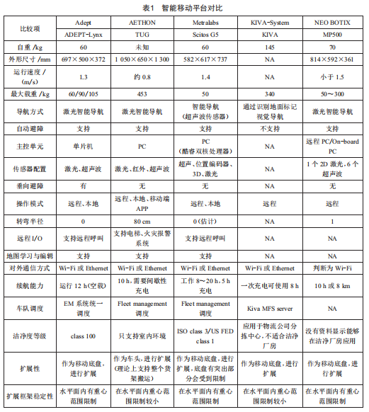 經(jīng)過前期調(diào)研 , 目前智能移動平臺產(chǎn)品較多 , 主要有:Adept公 司 的 Lynx、AETHON 公 司 的 Tug、Metra1abs 公 司 的 scitosG5、KIVA-system公司的KIVA以及NEOBOTIx公司的 MP系列 。對不同移動平臺的基本性能進(jìn)行了評估 ,結(jié)果如表1所示。