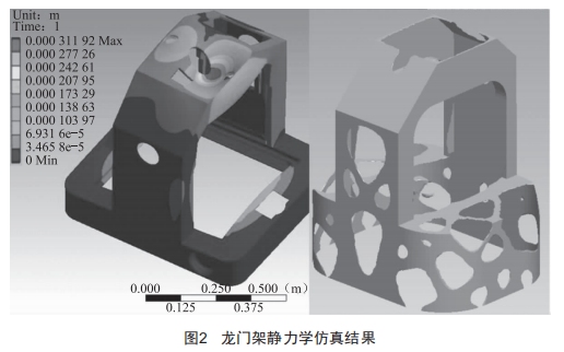 通過對龍門架進(jìn)行靜力學(xué)仿真分析(圖2) , 龍門架最大變形為0 .3 mm ,飯金厚度為2.0 mm,重10 kg ,滿足要求。