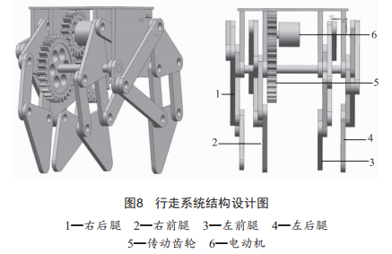 行走轉系是機器人教具完成物料搬運的關鍵部分,也是機器人其他轉系的安裝平臺,其性能優(yōu)劣直接影響到機器人運動的平穩(wěn)性和物料搬運的效率。本文統(tǒng)要采用多連桿復合機構進行四足仿生設計(圖8),模擬四足動物的行走方法,進一步為學生展現(xiàn)多連桿機構復雜運動的特點,使學生掌握構件數量、高副、低副與自由度的關轉,明確多連桿機構具有確定相對運動的條件。