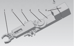 機械手系統(tǒng)設計主要包括肩關節(jié)、大臂、動力圓盤、槽輪、小臂、機械手等零部件的設計,肩關節(jié)通過較連接與胸腔本體連接,由肩齒輪提供動力完成肩部的轉動動作:大臂主要完成肩關節(jié)與小臂的連接,同時為槽輪系統(tǒng)提供安裝位置和強度支撐:槽輪系統(tǒng)包括槽輪和主動撥盤,主動撥盤較接于大臂,將液壓馬達的動力通過槽輪傳遞給槽輪,槽輪與機械小臂焊接為一體,可帶動小臂完成間歇轉動動作,根據機械手臂的動作需求,該液壓馬達應選擇大扭矩低轉速液壓馬達,保證小臂轉動的平穩(wěn)性:機械手通過液壓缸連接于小臂,通過液壓缸的伸縮完成機械手的抓取動作。機械手的具體設計如圖5所示。
