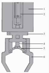 1一機械手2—小臂3一槽輪4—主動撥盤5—大臂6—肩關節(jié)