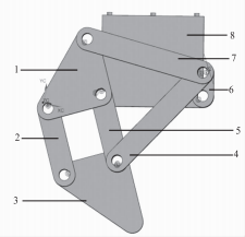 腿部結構中,機架8為固定件,曲柄6為動力部件并做勻速腰動,動力和運動通過連桿7、4、1、2、5,最終傳遞至連桿3,實現(xiàn)足部的移動和支撐。