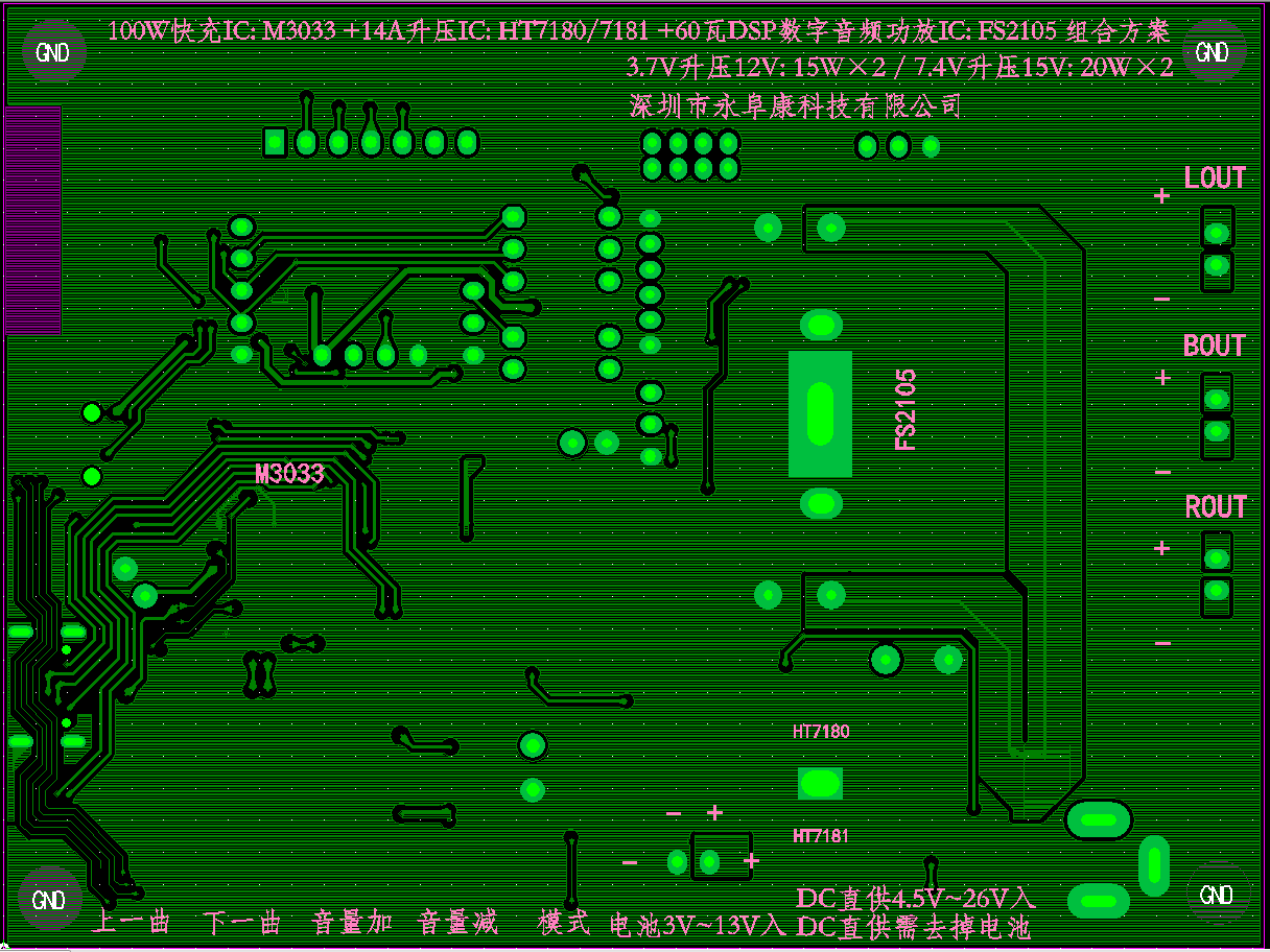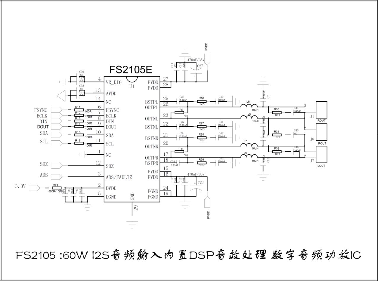 音頻放大部分采用FS2105,15V供電輸出2*20W/4歐(THD+1%);FS2105E是一款集成傅里葉FS Techno音效算法的雙通道中功率音頻放大芯片,最高支持2x30W立體聲BTL或60W單聲道PBTL輸出。相比較傳統(tǒng)模擬輸入的音頻功放,在底噪、信噪比等方面優(yōu)勢明顯;內(nèi)置15段EQ調(diào)節(jié)及三段DRC,簡潔的調(diào)音軟件界面工程師容易上手,實(shí)現(xiàn)完美的音質(zhì)輸出。