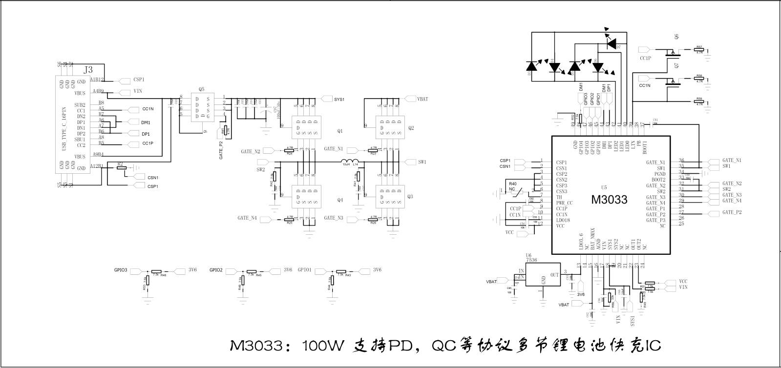 整體方案設(shè)計(jì)電源采用兩節(jié)鋰電串聯(lián)供電,充電芯片采用M3033;M3033是一款內(nèi)置PD2.0/QC2.0等快充協(xié)議的多節(jié)100W升降壓鋰電充電管理芯片,工作電壓范圍 4.5-25V、可支持2-7串鋰電快速充電?,F(xiàn)在隨著音箱功率越做越大,為保證續(xù)航時(shí)間而加大電池容量,戶外藍(lán)牙音箱很多采用兩串多并,傳統(tǒng)的充電管理芯片充電過程過于漫長,M3033能實(shí)現(xiàn)大容量鋰電池組快速充電。直接使用Type-C充電,無需專用適配器、避免資源浪費(fèi)。