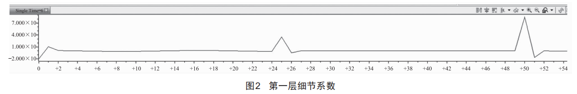 選用Db4小波函數(shù)對該信號進行尺度為3的分解處理,得到其第一層細節(jié)系數(shù)重構(gòu)圖,如圖2所示。從圖中可以看出:Db4小波可以有效地對電壓驟降信號的起始點與恢復(fù)點進行檢測與識別。但由于程序編寫原因,電壓驟降的起始點和恢復(fù)點分別定位在第25點和第50點。