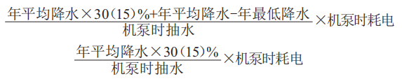 計(jì)算排灌電耗時(shí),還有一個(gè)重要的影響因素,即非正常降水。當(dāng)遇上影響降水的自然災(zāi)害時(shí),排灌電耗就會隨之增高。因此,在計(jì)算時(shí)應(yīng)加入變化系數(shù)。該系數(shù)由所遇自然災(zāi)害的種類及其嚴(yán)重性來確定,同時(shí)也受排灌區(qū)的地勢、地貌及水利設(shè)施影響。結(jié)合實(shí)際情況,給出了降水增加和降水減少兩種情況下增耗電能的計(jì)算公式: