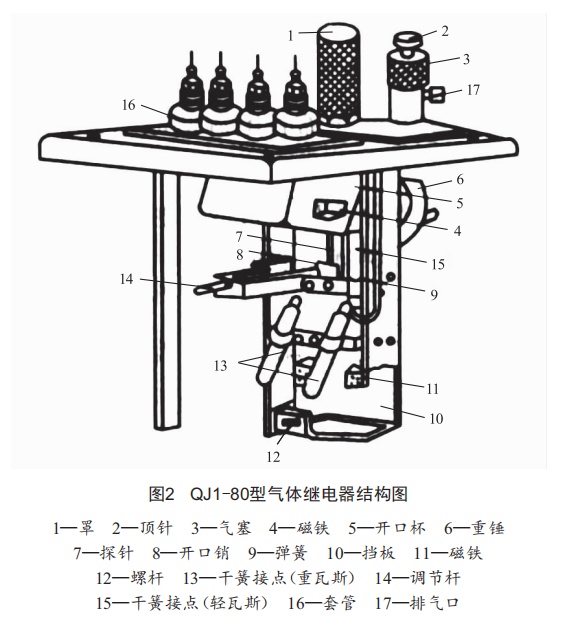 圖2為0J1一80氣體繼電器結(jié)構(gòu)圖,從圖中可以看出,其上開口杯接信號回路,下?lián)醢鍎t接跳閘回路。