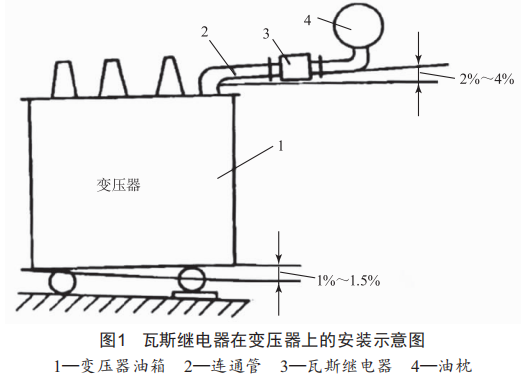 為了避免氣體在管路內(nèi)流動過程中產(chǎn)生窩氣的現(xiàn)象,瓦斯繼電器的安裝位置應(yīng)設(shè)置有2%~4%的安裝坡度,并采用有利于二次接線頭防水的安裝方式。
