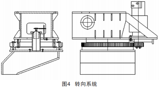 臺車采用全輪獨立轉向,轉向系統(tǒng)包括馬達、減速機、小齒輪、回轉支撐、編碼器等,馬達通過減速機帶動小齒輪,小齒輪與回轉支撐的外齒嚙合傳遞扭矩,實現(xiàn)轉向,結構如圖4所示。