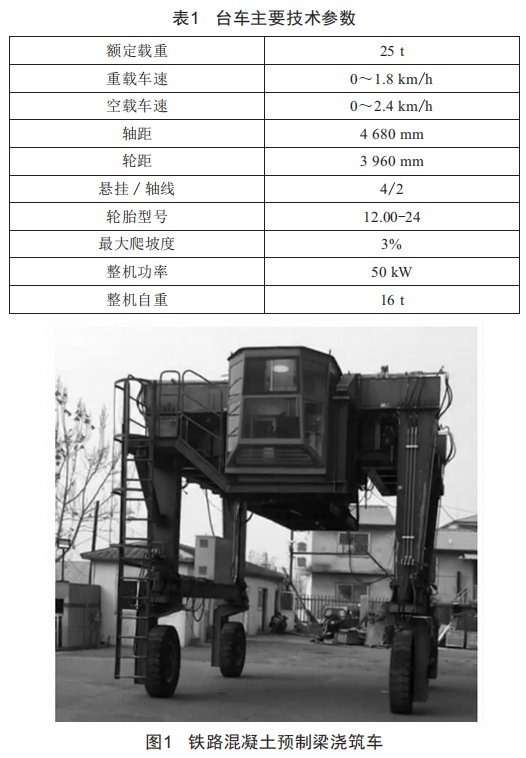 鐵路混凝土預制梁澆筑車(以下簡稱"臺車")是"機一電一液"相結合的高技術產品,采用液壓驅動、全橋剛性懸掛、獨立轉向,采用工業(yè)級微機來控制驅動、轉向,同時能夠實現(xiàn)直行、斜行、原地轉向等多種運行模式。整車運行靈活,可以在較小的場地完成工作任務,其技術參數(shù)如表1所示。