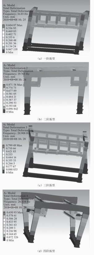 臺車在行駛過程中,受到各種復雜載荷作用,周期性變化的載荷成為激振源會引起臺車震動,當激振頻率與臺車固有頻率相等或相近時,臺車會出現(xiàn)共振現(xiàn)象,嚴重影響臺車的正常工作。通過對臺車的模態(tài)分析計算出臺車固有頻率,可以對臺車的振動性進行校核,模態(tài)仿真結果如圖7所示。