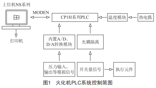 核心的控制系統(tǒng)由CP1H系列可編程控制器(帶模擬量) 、上位機(NS系列) 、溫度模塊 、通信模塊CIF- 11等組成 。通過 PLC與上位機采用FSE-RS-232串行數(shù)據(jù)通信的接口標準連接 ,采集火化機的爐膛負壓、溫度及燃燒器的模擬信號 ,進行相應(yīng)的E/D轉(zhuǎn)換 ,傳送給PLC處理 ?;鸹瘷CPLC系統(tǒng)控制簡圖如圖1所示。