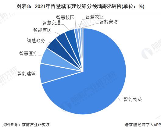 注:2021年數(shù)據(jù)根據(jù)IDC往年公告數(shù)據(jù)核算,屆時(shí)以官方數(shù)據(jù)為準(zhǔn)。3、智慧物流成為最大的細(xì)分領(lǐng)域隨著我國(guó)大力推進(jìn)“新基建”建設(shè),數(shù)字基礎(chǔ)設(shè)施作為數(shù)字政府、智慧城市和數(shù)字經(jīng)濟(jì)發(fā)展的重要支撐,引領(lǐng)新一輪社會(huì)投資熱潮。賽迪研究報(bào)告顯示,未來(lái)三年,在物聯(lián)網(wǎng)應(yīng)用領(lǐng)域,智慧電力、智能工業(yè)、智能安防、智慧交通、智慧醫(yī)療等領(lǐng)域的物聯(lián)程度將會(huì)持續(xù)提升。前瞻初步核算,2021年我國(guó)智慧城市建設(shè)細(xì)分領(lǐng)域中智能物流占比最高。