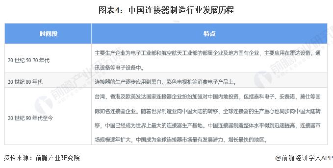 我國連接器制造行業(yè)的發(fā)展歷程大致經(jīng)歷了三個(gè)階段,這三個(gè)階段分別對(duì)應(yīng)20世紀(jì)50-70年代、20世紀(jì)80年代和20世紀(jì)90年代至今三個(gè)時(shí)間跨度,我國連接器的生產(chǎn)應(yīng)用從電子設(shè)備衍生到電子產(chǎn)品,生產(chǎn)企業(yè)從國有企業(yè)到私企再到多個(gè)國際知名連接器企業(yè)紛紛進(jìn)入中國市場(chǎng),我國連接器行業(yè)實(shí)現(xiàn)了巨大的飛躍和突破。