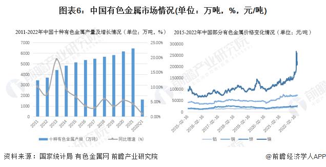 其次是有色金屬市場(chǎng),2011-2021年,我國十種有色金屬產(chǎn)量持續(xù)增長(zhǎng),2019-2021年兩年平均增長(zhǎng)5.1%。其中,精煉銅產(chǎn)量1048.7萬噸,增長(zhǎng)7.4%,兩年平均增長(zhǎng)3.5%;原鋁產(chǎn)量3850.3萬噸,增長(zhǎng)4.8%,兩年平均增長(zhǎng)4.8%;從價(jià)格上看,進(jìn)入2022年后,我國的有色金屬價(jià)格均有不同程度的上漲。
