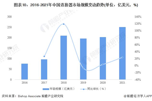 2、需求:市場(chǎng)規(guī)??焖僭鲩L(zhǎng)根據(jù)Bishop&Associate統(tǒng)計(jì)數(shù)據(jù)顯示,2016-2021年中國連接器市場(chǎng)規(guī)模呈現(xiàn)上升趨勢(shì),2021年中國連接器市場(chǎng)規(guī)??傮w達(dá)到249.78億美元,同比上升23.8%。