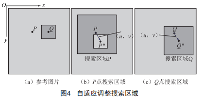 為了解決上述問題,本文提出一種自適應(yīng)調(diào)整搜索區(qū)域的方法,如圖4所示。假設(shè)圖4(a)中P點為該參考圖像的初始待匹配點,此時與傳統(tǒng)方法相同,在目標圖像中以P點坐標為中心選取一個較大的矩形區(qū)域作為搜索區(qū)域P,如圖4(b)所示。當(dāng)搜索完成后得到最佳匹配點為P*,記錄當(dāng)前匹配點的位移量(u,,)。在進行相鄰匹配點Q的搜索時,在目標圖像中找到Q點位移(u,,)后對應(yīng)的Q*,此時以Q*為中心,選取一個小于搜索區(qū)域P的矩形區(qū)域作為Q點的搜索區(qū)域,如圖4(c)所示。然后在該搜索區(qū)域內(nèi)搜索Q點的最佳匹配點,完成搜索,記錄Q點的位移量(u0,,0),并作為位移值對下一點搜索區(qū)域進行調(diào)整。該方法通過對搜索區(qū)域的位置和大小進行自適應(yīng)調(diào)整,提高搜索區(qū)域選擇的靈活性,并進一步降低搜索時間,提高算法匹配搜索的效率。