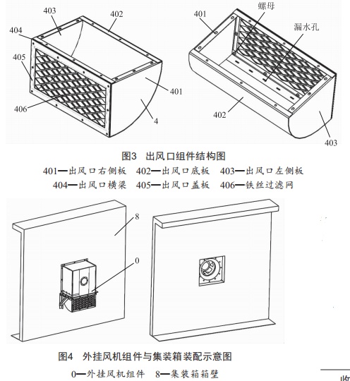 如圖3所示,出風(fēng)口右側(cè)板、出風(fēng)口底板、出風(fēng)口左側(cè)板及出風(fēng)口橫梁焊接形成出風(fēng)口支架:出風(fēng)口底板上有漏水孔:出風(fēng)口蓋板和鐵絲過濾網(wǎng)焊接成出風(fēng)口蓋板組件:將出風(fēng)口蓋板組件安裝在出風(fēng)口支架上,形成出風(fēng)口組件。如圖4所示,最后將外掛風(fēng)機(jī)組件安裝在集裝箱的外墻壁上,風(fēng)機(jī)線穿過風(fēng)機(jī)組件后進(jìn)入集裝箱體內(nèi)。