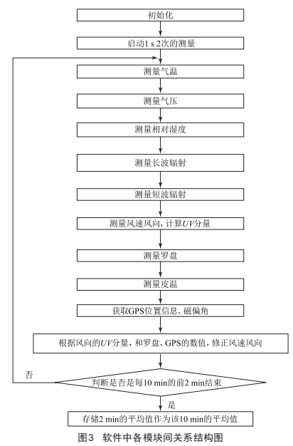 根據(jù)CRBaSic中的函數(shù)以及轉(zhuǎn)換公式,開始順序測量氣溫、氣壓、相對濕度、長波輻射、短波輻射、風(fēng)速風(fēng)向、羅盤、皮溫,獲取GPS數(shù)據(jù),然后根據(jù)算法修正風(fēng)速風(fēng)向的值。