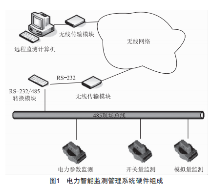 電力監(jiān)測現(xiàn)場由電力監(jiān)測終端、現(xiàn)場總線、接口轉(zhuǎn)換器和無線數(shù)傳模塊組成。