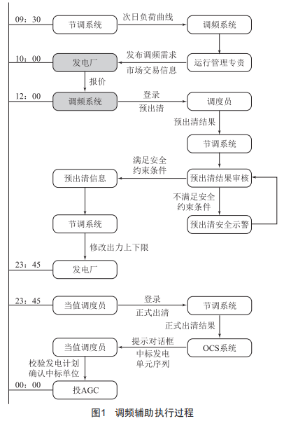 電力批發(fā)市場交易機制中關鍵部分是調頻輔助。調頻輔助服務,通過引入對調頻資源的經濟補償,用市場價格的高低確定調頻資源的調用次序及補償價格。通過引入競爭,使市場在調頻資源的配置中起決定性作用,降低調頻服務的供應成本,實現全網的資源優(yōu)化配置。調頻輔助執(zhí)行過程如圖1所示。