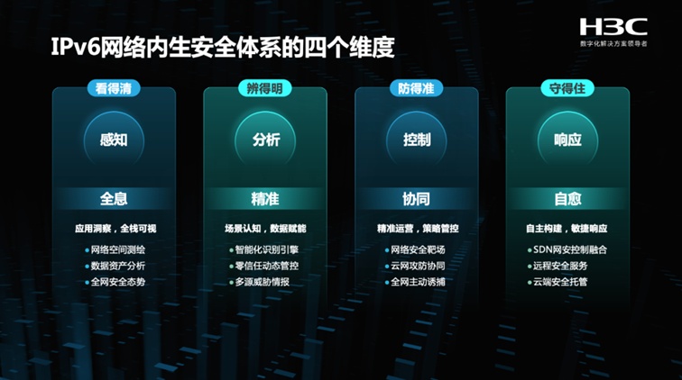 在網(wǎng)絡(luò)的安全方面,IPv6新協(xié)議架構(gòu)也將帶來安全領(lǐng)域的技術(shù)創(chuàng)新和體系架構(gòu)變革,從而為解決IPv6+時代的網(wǎng)絡(luò)的安全問題提供新思路、新方法和新手段。新華三基于IPv6+內(nèi)置安全屬性和安全技術(shù)創(chuàng)新來構(gòu)建適用于IPv6+時代的網(wǎng)絡(luò)的安全體系,并提出了“四維一體” IPv6+網(wǎng)絡(luò)內(nèi)生安全體系,從感知維解決應(yīng)用洞察和全??梢?,從分析維解決場景認知和數(shù)據(jù)賦能,從控制維解決精準運營和策略管控,從響應(yīng)維解決自主構(gòu)建,敏捷響應(yīng)。