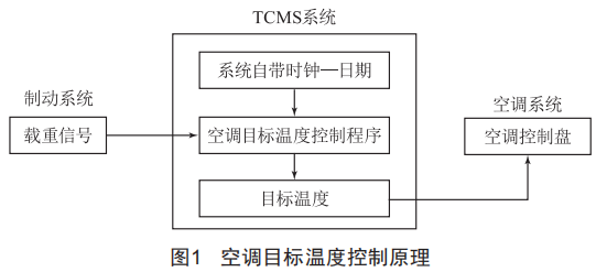 智能控制空調(diào)目標(biāo)溫度原理:列車轉(zhuǎn)向架二系空氣彈簧通過均壓閥產(chǎn)生載重空氣信號,車重空氣信號用來控制EPAC2智能閥中的中繼閥,在實現(xiàn)制動調(diào)整功能的同時,通過EPAC2智能閥和TCMS系統(tǒng)的接口將列車載重信號上傳發(fā)送至TCMS系統(tǒng),TCMS系統(tǒng)中空調(diào)目標(biāo)溫度控制程序接收來自制動系統(tǒng)的載重信號和TCMS系統(tǒng)自帶的時鐘日期,根據(jù)邏輯判斷生成目標(biāo)溫度,通過TCMS系統(tǒng)和空調(diào)系統(tǒng)的接口發(fā)送至空調(diào)控制盤,空調(diào)系統(tǒng)根據(jù)指定的目標(biāo)溫度進行控制,如圖1所示。