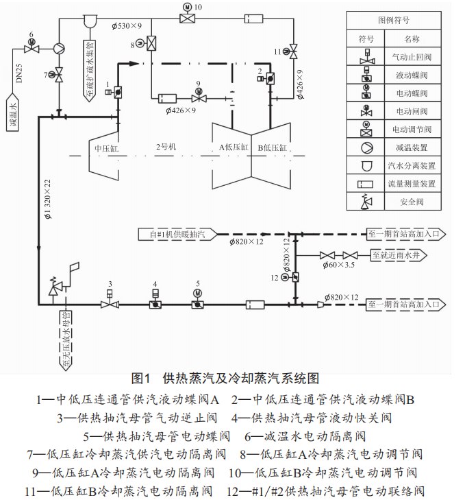 切除低壓缸進汽(低壓缸零出力)供熱系統(tǒng)中,低壓缸處于高真空運行狀態(tài),采用三偏心金屬密封液動蝶閥,閥門關閉能夠達到零泄漏要求,以此切斷低壓缸原進汽管道,低壓缸需要通過一定的冷卻蒸汽流量,同時也能保證低壓缸處于熱備用。因該蝶閥口徑DN1300很大,冷卻蒸汽流量要控制在額定流量的5%以內(nèi),若要將流量控制在如此小的范圍內(nèi),閥門前后壓差會很大,目前市場上找不到能滿足供貨要求的液控蝶閥,因此設計旁路蒸汽管路,在旁路蒸汽管路上設置調(diào)節(jié)閥和流量孔板,冷卻流量可以進行調(diào)試試驗,以機組振動和脹差在允許范圍、低壓缸末級葉片處溫度低作為評判準則,確定合理的冷卻流量。冷卻蒸汽汽源取自中壓缸排汽的供熱抽汽管道,接入點為中低壓缸連通管低壓缸入口垂直管段。切除低壓缸供熱改造后,除上述少量蒸汽用于低壓缸的冷卻外,其余中壓缸排汽均對外供熱。供熱母道上依次設置氣動逆止閥、液動快關閥、供熱關斷閥(圖1)。
