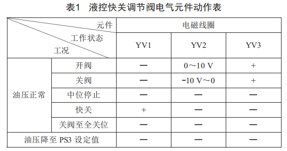 汽輪機是發(fā)電廠的主要設備,為防止緊急情況發(fā)生時,抽汽管道中的水和蒸汽瞬間倒流,影響汽輪機的運行安全,需在靠近汽輪機側的抽汽管道上設置逆止閥。為滿足機組運行要求,通常在供熱抽汽管道上還需要設置抽汽截止閥(電動蝶閥或電動閘閥)。但不管是電動蝶閥或電動閘閥,還是抽汽逆止閥,其閥門的關閉時間都大于1S,無法滿足緊急情況下快速關閉的要求。因此,在供熱抽汽母管上除設置常規(guī)的氣動抽汽逆止閥、電動蝶閥外,另設置一臺液動快速關閉閥,通過其中的快關電磁閥使主閥體油缸內(nèi)回油進至有桿腔,使油缸活塞快速退回,閥門快速關閉(圖2)。表1所示為各工況下電磁線圈的動作情況。
