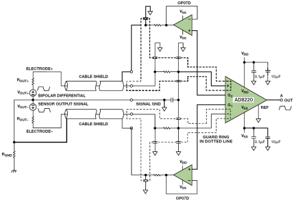 為了最大程度降低泄漏電流,在PCB走線中,也可參考示意圖中虛線部分,將緩沖電壓連接至輸入信號路徑周圍的未屏蔽走線區(qū)域,從而保護傳感器輸出信號。